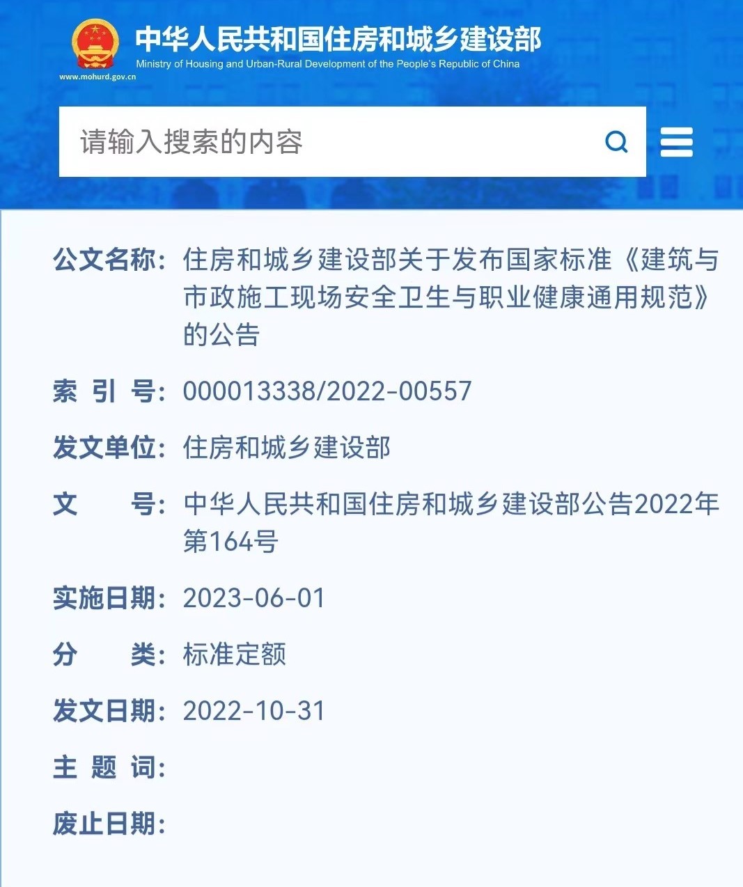 住房和城乡建设部关于发布国家标准 《建筑与市政施工现场安全卫生与 职业健康通用规范》的公告